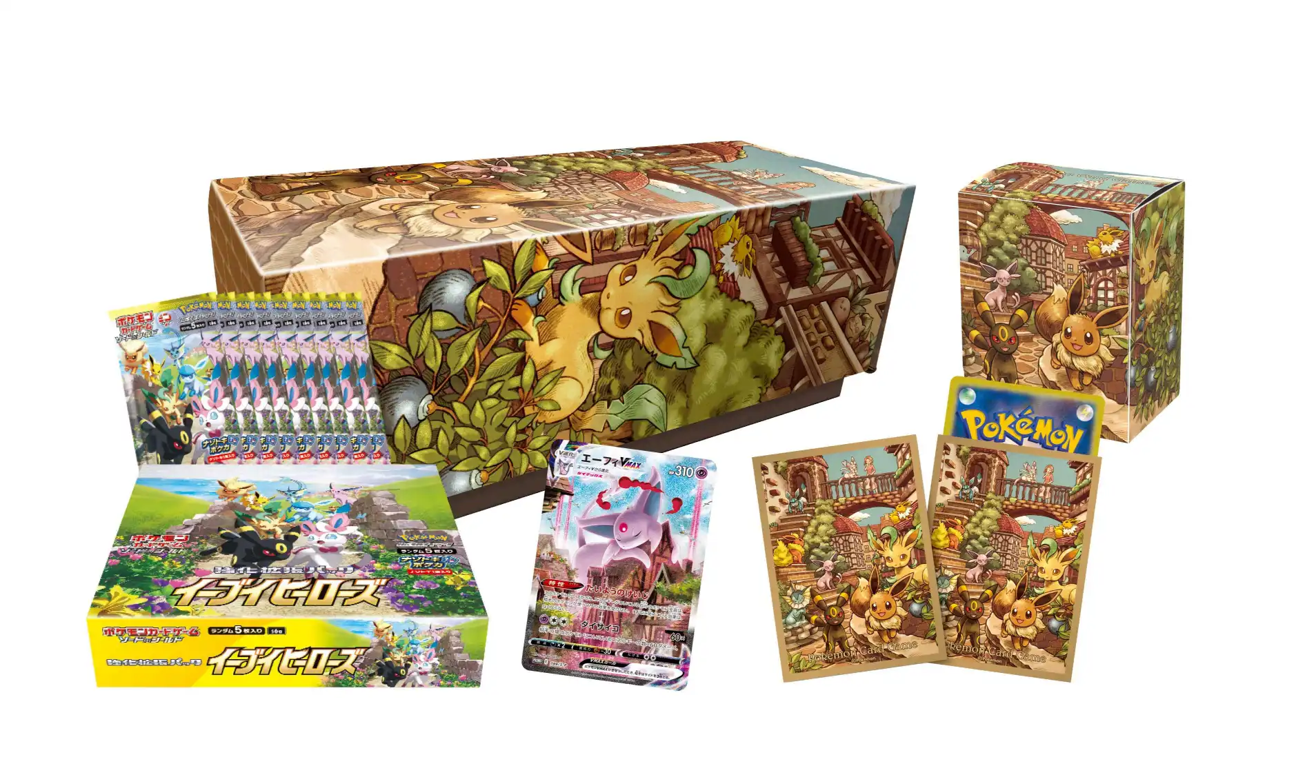 ニンフィアVMAX SA(PROMO)やイーブイヒーローズ未開封BOXに加え、ブイズ関連グッズがまとめて入った豪華なセットです。